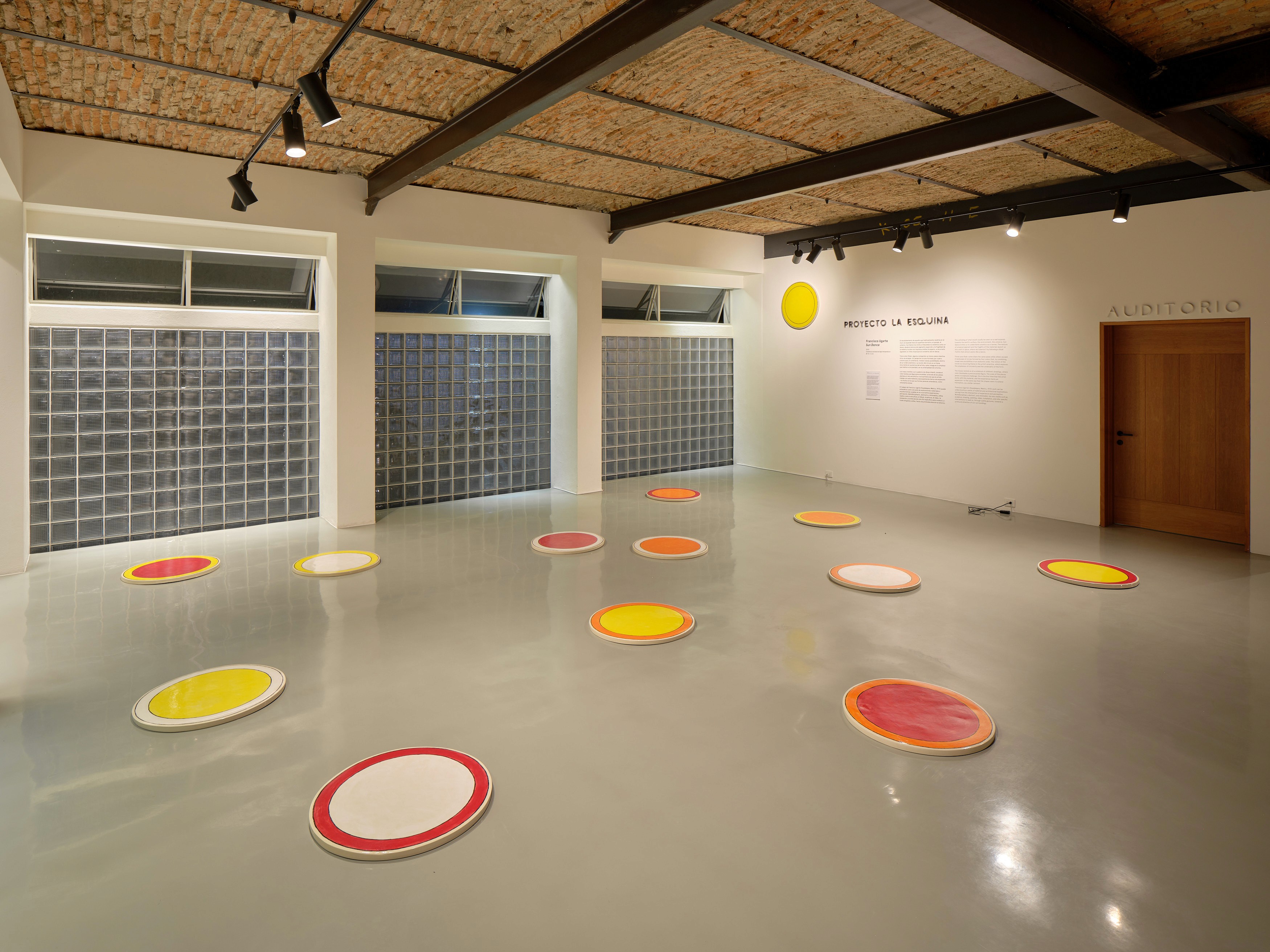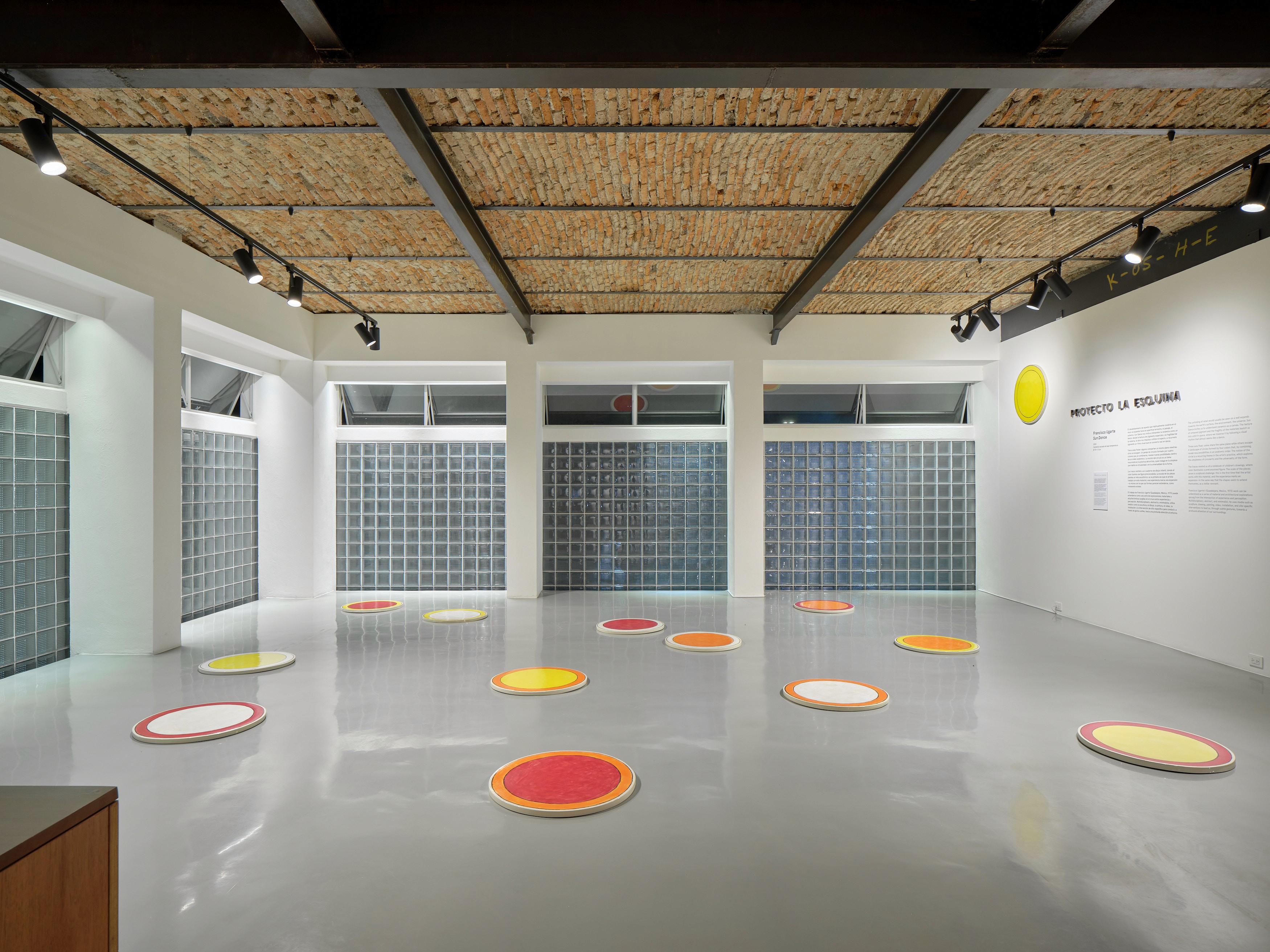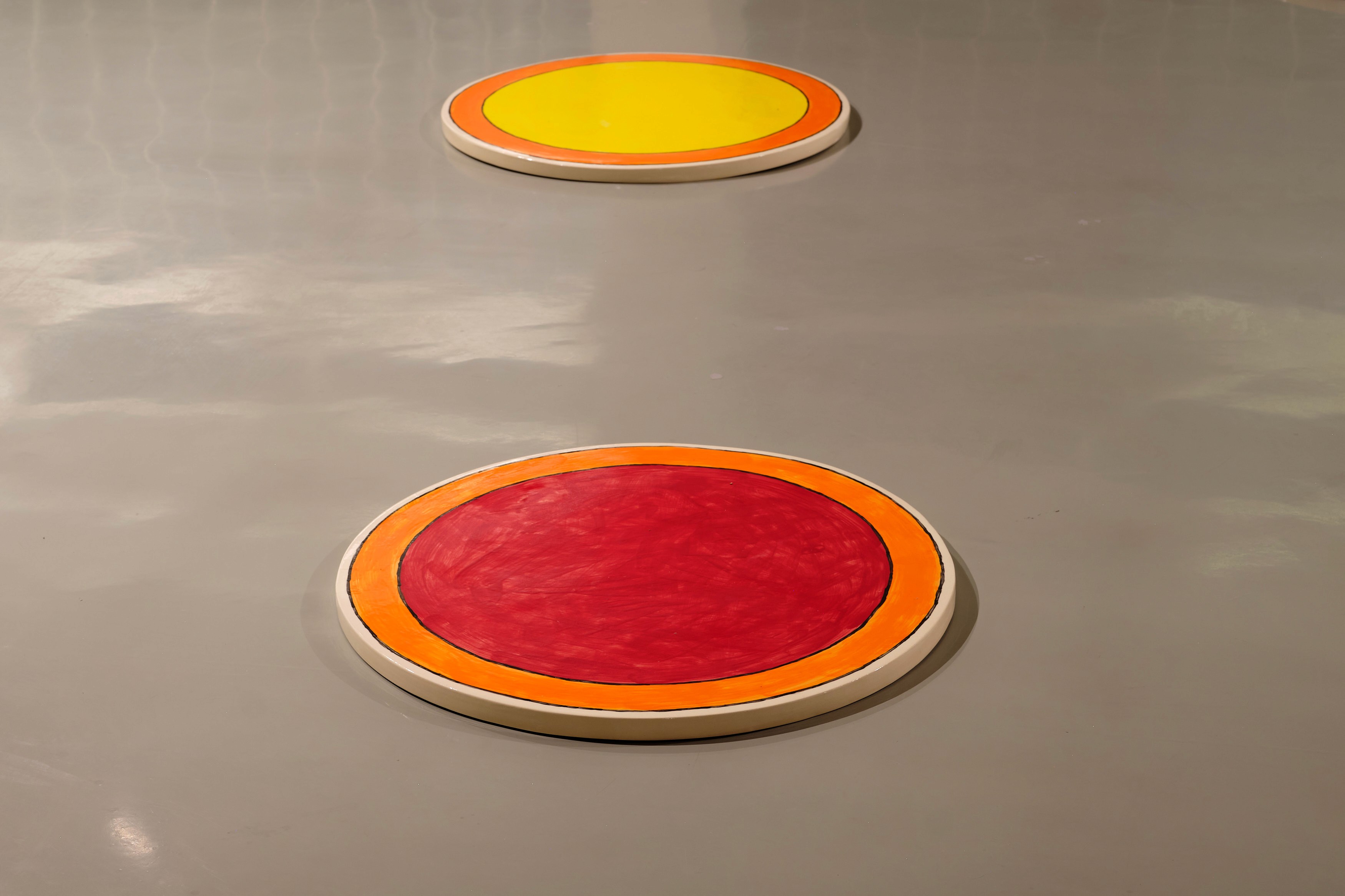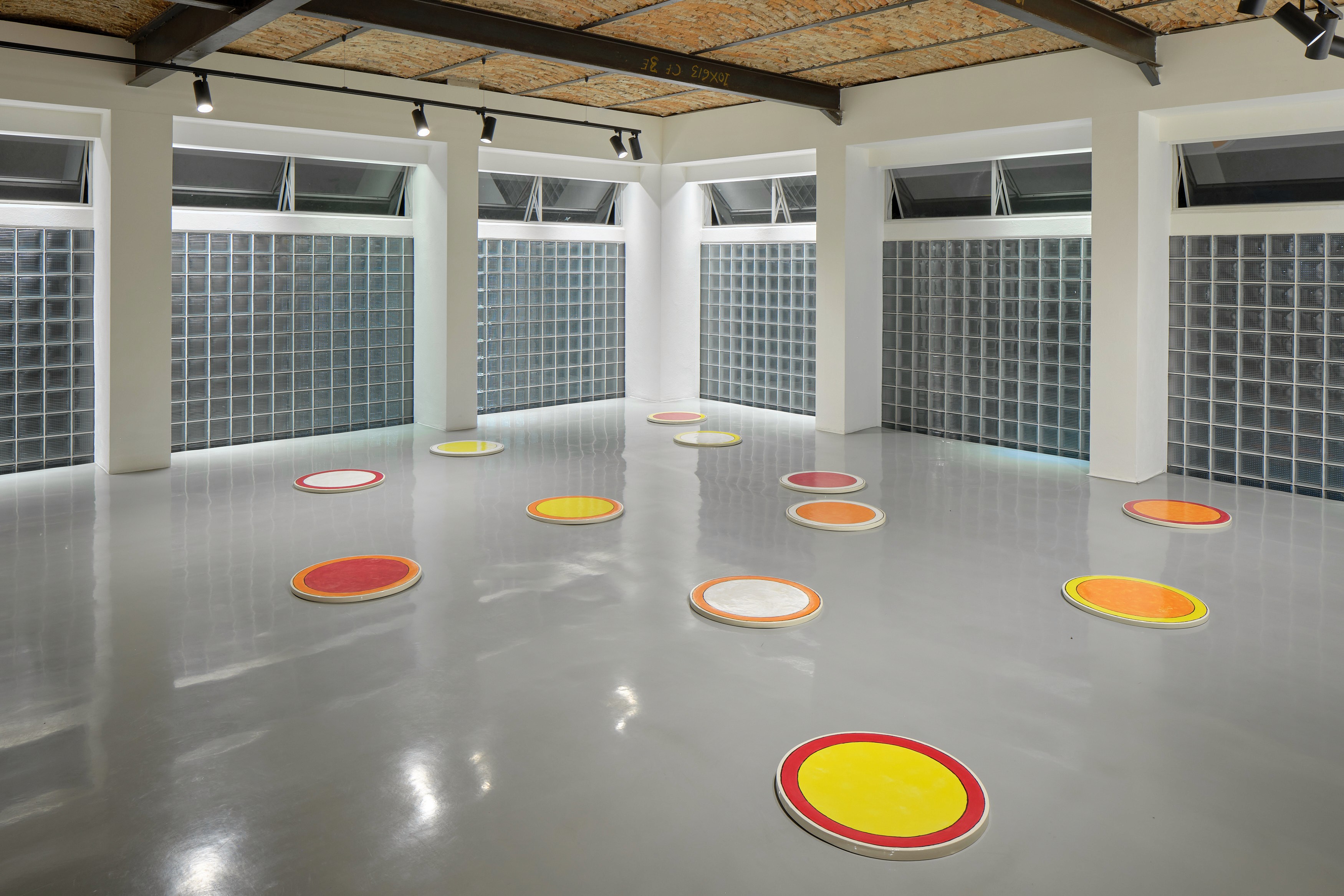 Trece soles flotan: algunos comparten un mismo plano mientras otros se escapan. Un paraje de círculos formado por cuatro colores que, al combinarse, revelan nuevas posibilidades dentro de un orden anatómico. La noción del círculo es un tema recurrente en la práctica del artista, quien indaga en la simpleza que habita la circularidad y en la universalidad de la forma.
